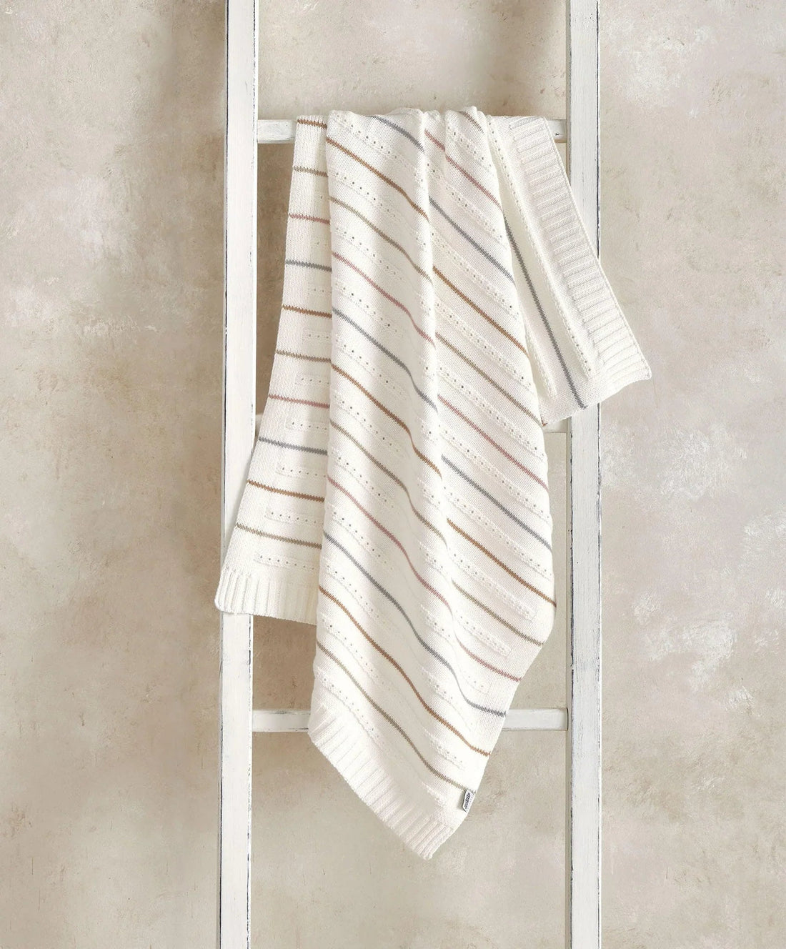 Beautiful neutral-striped blanket featuring a fine knitted pattern and ribbed edging, made from 100% soft...
