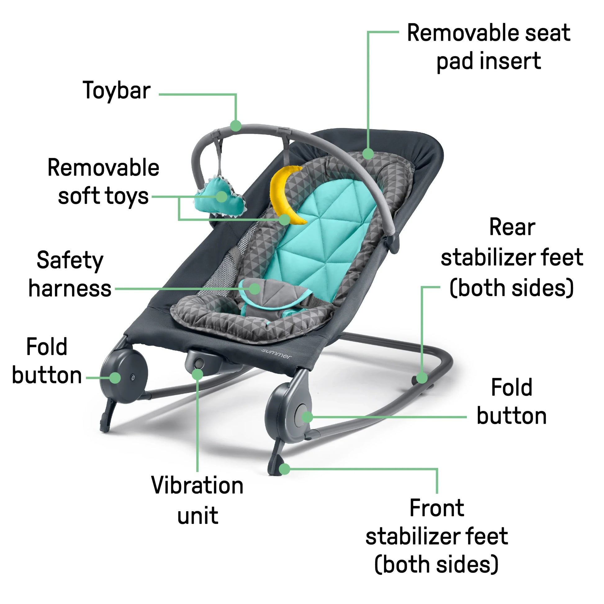 The Summer 2-in-1 Bouncer & Rocker Duo solves your need to choose between a rocker or bouncer. This 2-in-1 design lets parents easily switch between bouncing mode and rocking mode, depending on what style your baby prefers. If your infant enjoys a smooth back-and-forth motion, the rocker mode is sure to soothe them. If they prefer to bounce, just flip out the stabilizing feet. The removable toy bar features two soft toys that baby can reach for or bat to entertain themselves. One C battery powers the soothing vibration feature in this portable bouncer and rocker, which shuts off automatically after 15 minutes. The Bouncer & Rocker Duo folds completely flat for storage and travel, so you can bring it with you when you need it most. For easy cleaning, the seat pad can be removed and thrown in the washing machine.