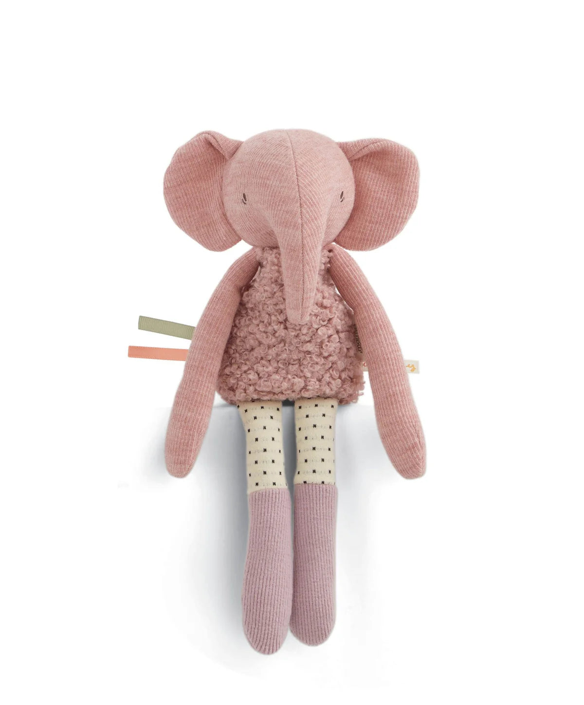 Our delightful miniature Edie Elephant activity toy is the perfect companion for both playtime and snuggles on the go. With a mix of textures, colours, and sounds to explore, she’ll captivate baby’s senses while her super-soft fabrics and squishy, bean-filled body provide soothing comfort.