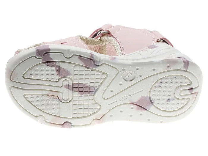 Baby sandals in synthetic leather and textile. Fasten with Velcro for easy wear and adjustment. 100% leather anatomical insole. Non-slip rubber sole.