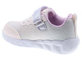 A child's white trainer shoe with a hook-and-loop strap closure, featuring a design with pastel pink, purple, and blue accents. The side of the shoe has a large pink star with glitter detail, and several smaller stars are visible on the strap. The sole of the shoe appears to light up, with three prominent white lights visible near the front. The shoe has a mesh-like texture on the upper and a slightly chunky sole.