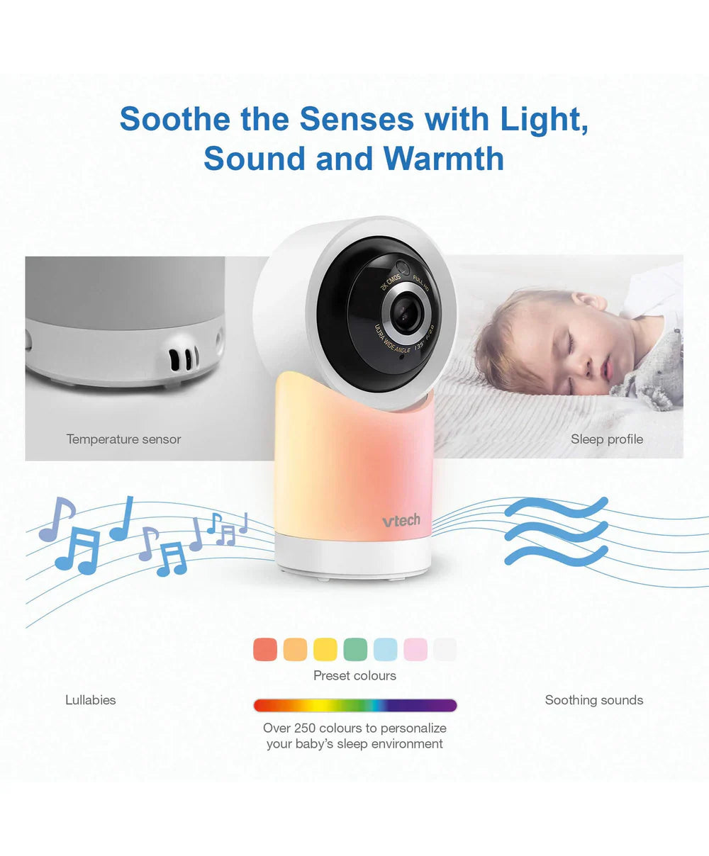 This 5" HD colour monitor allows you clearly see your little one on the parent unit. You can achieve 360 degrees up & down from the parent unit or remote & 10 remote digital x zoom. Free live remote access via a smartphone, with up to 15 hours of video & 22 hours of audio battery life. A soothing multi colour light on the baby unit gently illuminates a dark nursery with a choice of colours. Five soothing sounds and lullabies will help settle baby to sleep. With two-way talk back intercom to sooth baby with your own voice. The humidity & temperature sensor will help you control the ideal sleeping environment.