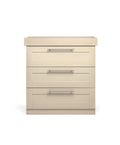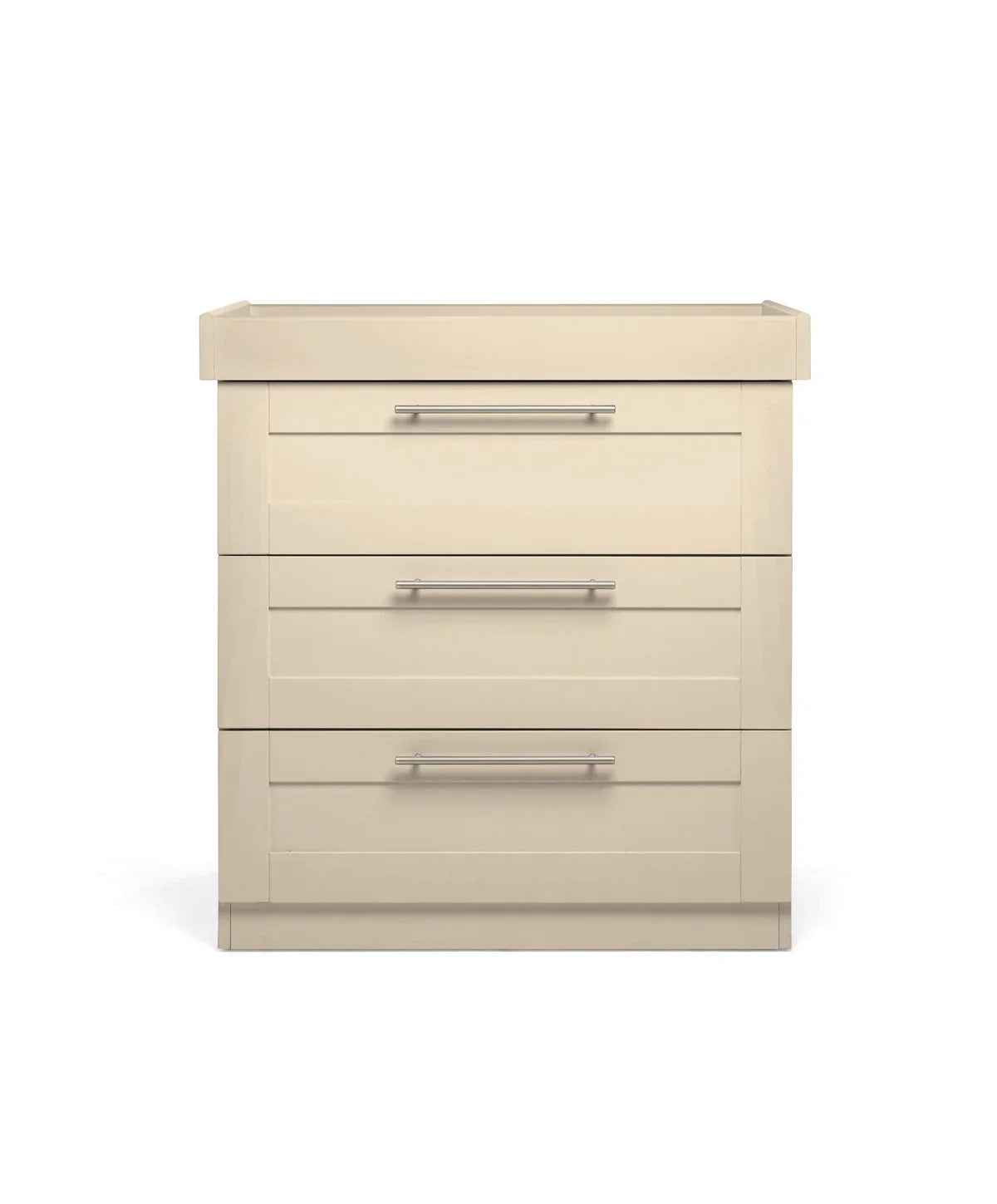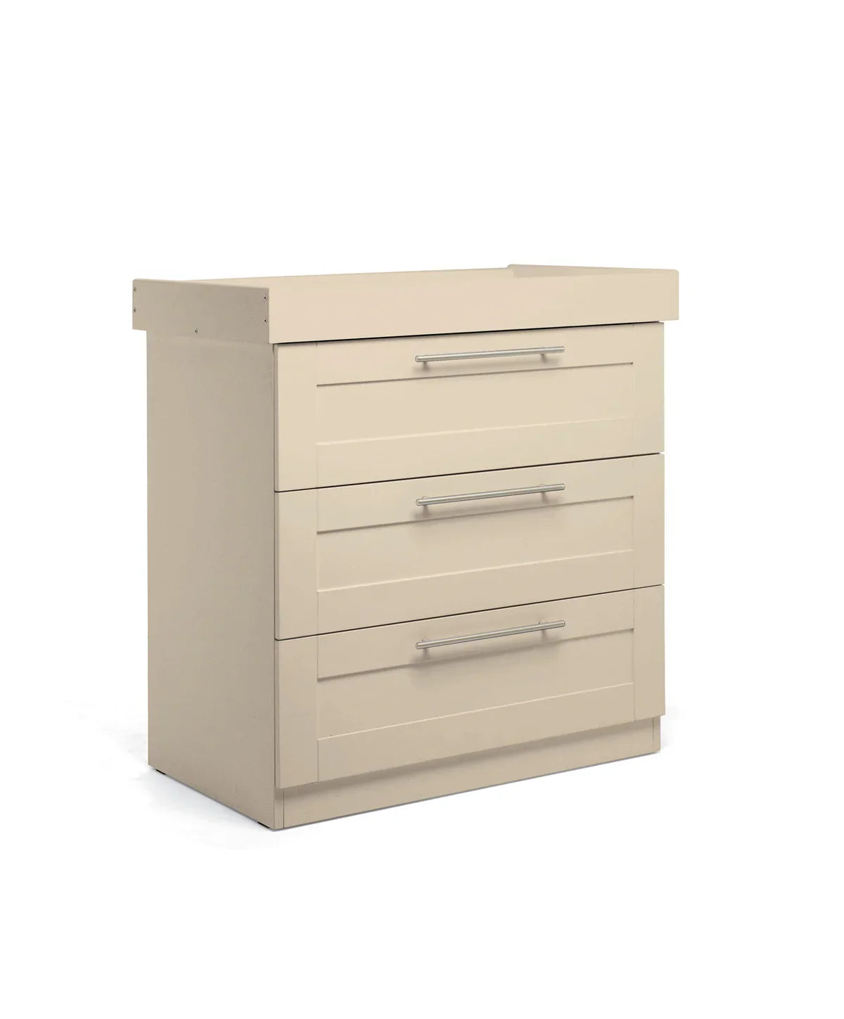 Hampden’s convertible dresser/changer in shade Cashmere, a soft neutral that pairs well with a range of interiors to offer a sophisticated and calming atmosphere. With chic metal handle details and clean, minimalist design. Removeable changing top allows you to use your dresser for years, once your little one is all grown up. With three deep drawers for maximum storage.