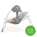 Life isn’t lived in one place. When you have places to go, the Comfort 2 Go Portable Swing is easy to take with you. The compact frame is easy to transport, with all the same features you’d expect from a full-sized swing. Your baby can rest easy while enjoying automatic swinging motions, listening to soothing melodies, and reaching for the plush hanging toys. Specially designed by Ingenuity to make parenting easier, you don’t have to sacrifice function with this mini swing. The 5-point harness and non-slip feet ensure your baby’s safety, and comfort is in full swing with the ultra soft seat pad. The swing grows with your baby thanks to weight-sensing technology, and the extra head support can be removed when baby outgrows it. Your baby’s happy place can be at home or on-the-go with this swing.