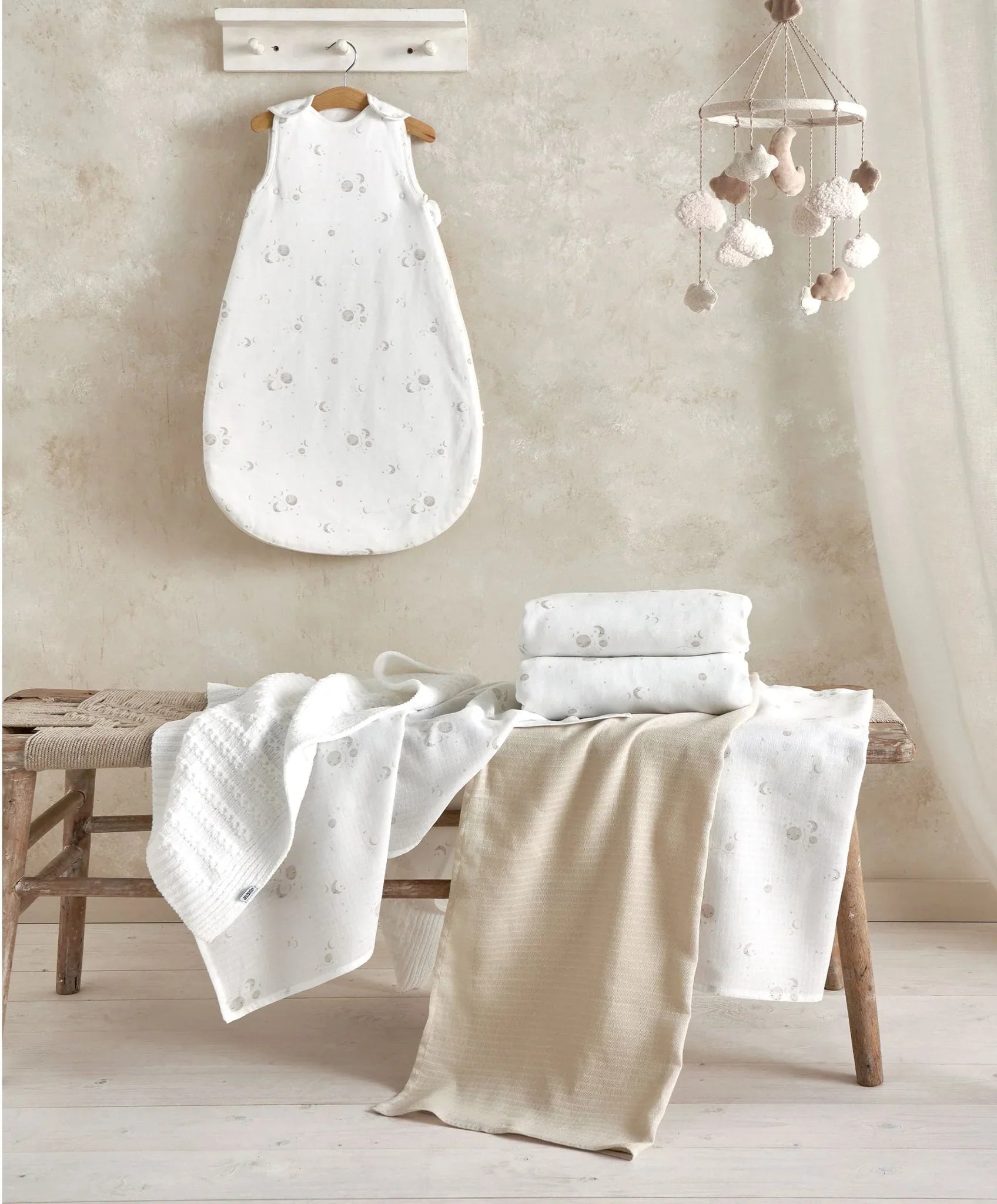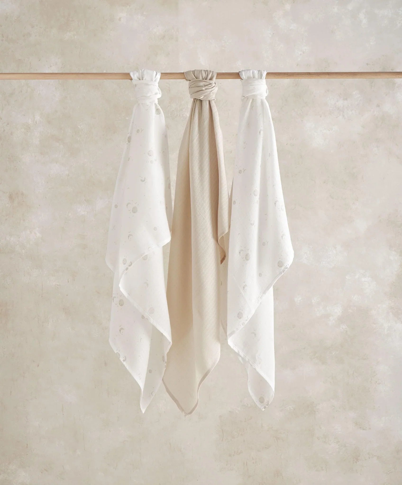 Handy 3-pack of versatile muslin squares in a large 90cm x 90cm size. Featuring delicate, illustrated detail and neutral colours to coordinate with this collection. Includes 2 cosmic print muslins and 1 pure muslin in a soft sand shade. Crafted from super-soft cotton.