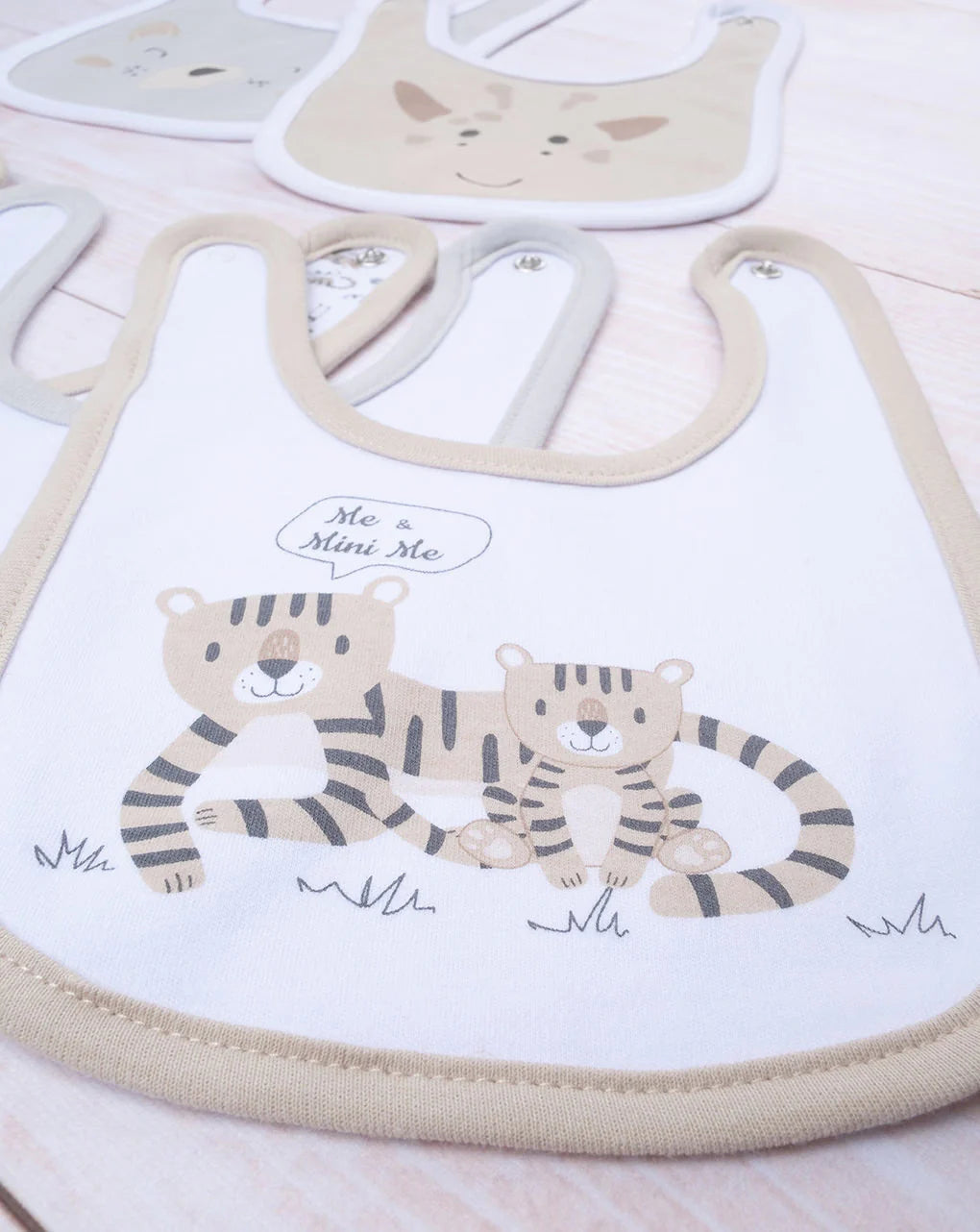 A cute set of 5 baby bibs. The items feature cream, gray, and beige backgrounds and are decorated with cute jungle animal prints. They're easy to put on and take off thanks to a snap on the neckline. Accessories not for sale. The package contains the item of clothing only.