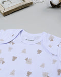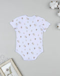 Basic short-sleeved baby bodysuit. The piece features a white base with a matching teddy bear print. The snaps at the crotch provide a loose and practical fit. Made from OEKO-TEX certified cotton, tested for harmful substances, it guarantees high safety. Accessories are not for sale. The package contains the clothing item only.
