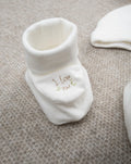 A cute little girl's hat and booties pack. The cream-white hat features a turn-up cuff and embroidered animal; the matching booties have a stable sole. The item is made of OEKO-TEX® cotton, tested for harmful substances and ensuring high safety. Accessories not for sale. The package contains the clothing item only.