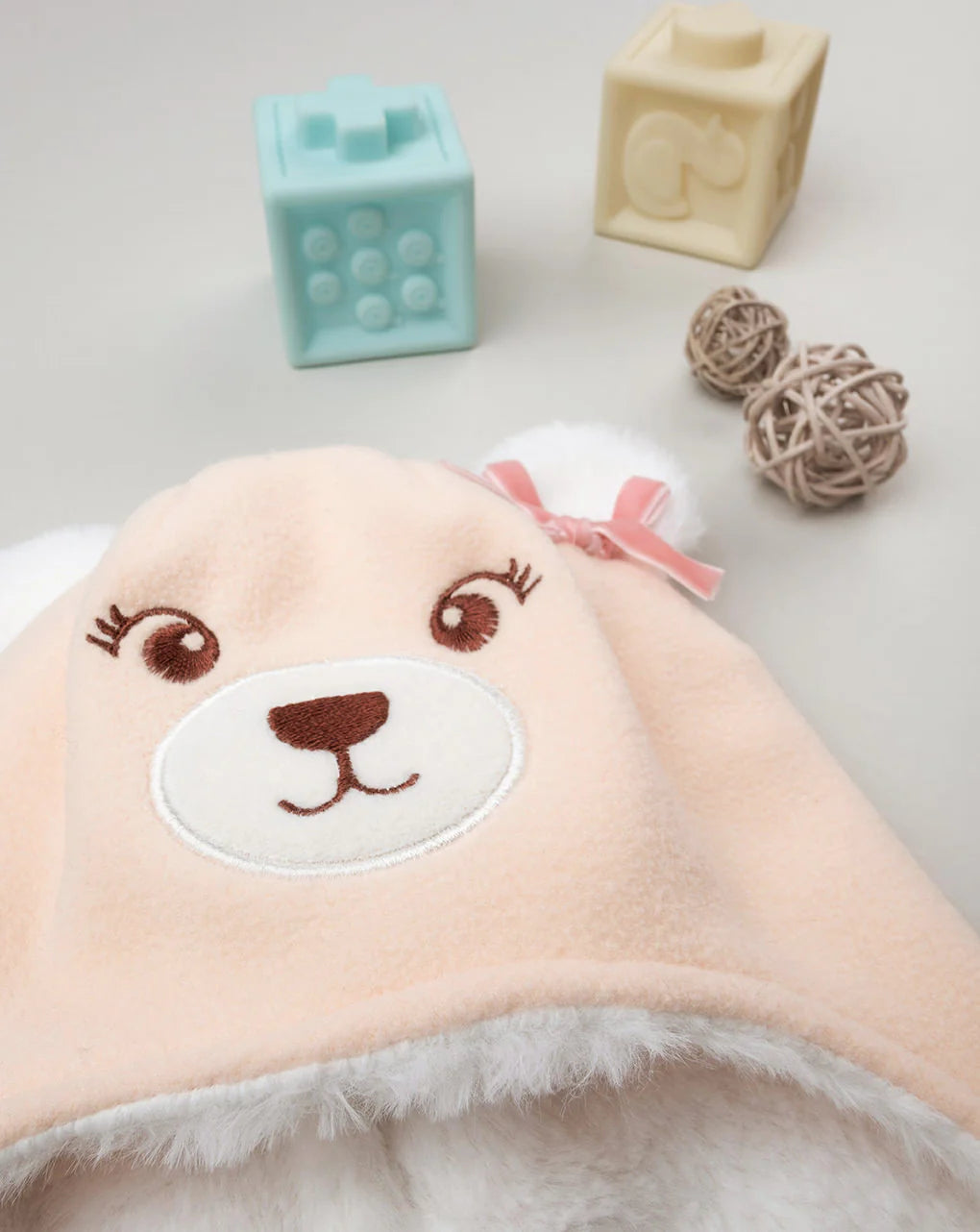 A casual hat with earflaps for children. The piece features a light pink background with a stylized teddy bear motif and a brown fabric interior. It features ears attached to the top. This soft and snug hat is ideal for casual occasions. Accessories not for sale. The package contains the clothing item only.