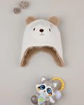 A casual hat with earflaps for children. The piece features a cream background with a stylized teddy bear and a brown fabric interior. It features ears attached to the top. This soft and snug hat is ideal for casual occasions. Accessories not for sale. The package contains the clothing item only.