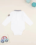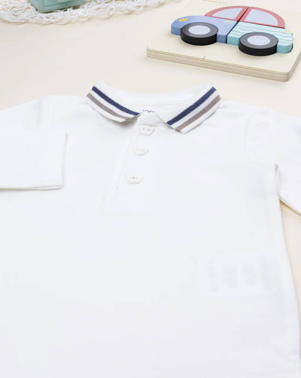 A basic, long-sleeved bodysuit for boys. The piece is all white with a matching bear patch on the collar. The snaps at the crotch and front provide a loose, practical fit. Made from OEKO-TEX® cotton, tested for harmful substances, it guarantees high safety. Accessories are not for sale. The package contains the item only.
