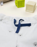 Casual twill trousers for boys. The beige trousers feature an allover blue print and side pockets. The loose fit is adjustable thanks to a blue drawstring waistband. These boys' trousers are suitable for casual occasions. The trousers are made from OEKO-TEX certified cotton, tested for harmful substances and guaranteeing high safety. Accessories are not for sale. The package contains the item of clothing only.