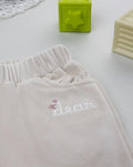 Casual chenille trousers for girls. The piece is all-beige with a small, matching embroidery and side pockets accented with matching frills. The fit is relaxed and adjustable thanks to the elastic waistband. These girls' trousers are suitable for casual occasions and are easy to combine. Accessories not for sale. The package contains the item of clothing only.