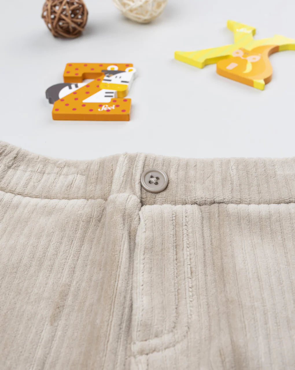 Boys' faux corduroy trousers. The item is all beige with side pockets. The buttonhole provides a relaxed and practical fit. These boys' trousers are suitable for casual occasions. Accessories are not for sale. The package contains the item only.