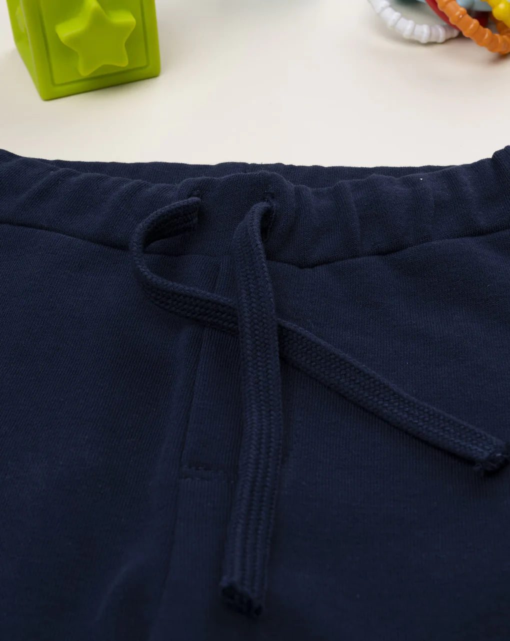 Basic French terry trousers for boys. The piece comes in all-night blue. The fit is relaxed and adjustable thanks to a drawstring waistband with a matching drawstring. These trousers are suitable for casual occasions and can be easily combined. Accessories not for sale. The package contains the item of clothing only.