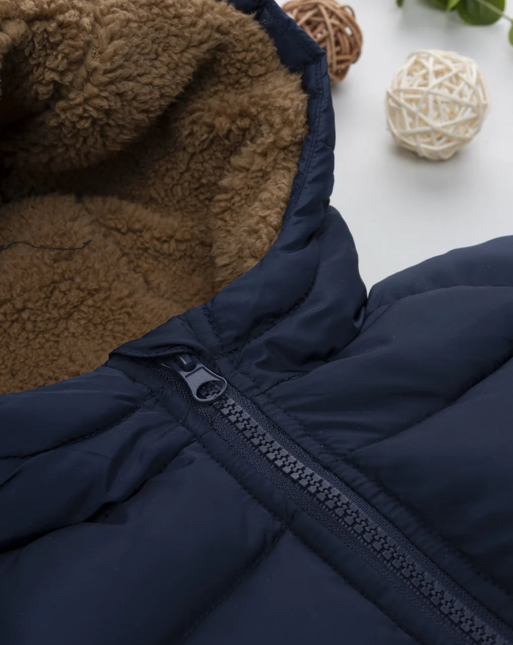 A casual boys' hooded down jacket. The jacket comes in all-night blue with side pockets and faux fur lining. The front zip provides a comfortable, practical fit. This boys' down jacket is waterproof and suitable for casual occasions. Accessories are not for sale. The package contains the clothing item only.