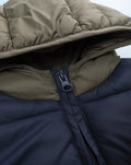Casual hooded vest for boys in recycled polyester. The garment comes in a two-tone midnight blue and military green version, with side pockets. The front zip closure provides a relaxed and practical fit. This boys' vest is suitable for casual occasions. Accessories not for sale. The package contains the item of clothing only.
