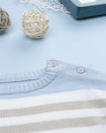 Casual boys' tricot sweater. The piece features a light blue and beige striped pattern. The fit is relaxed and practical thanks to the shoulder buttonholes. This boys' tricot sweater is suitable for casual occasions and easy to combine. Accessories not for sale. The package contains the item of clothing only.