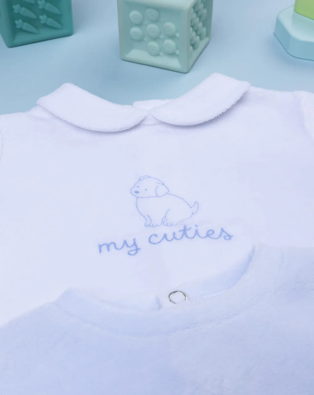 A double chenille baby set designed for a baby's layette. The shirts come in white and blue and can be mixed and matched. Contrasting dog-themed prints enhance the look and add a touch of sweetness. The long-sleeved shirts have a convenient snap closure on the back. The leggings have an elastic waist for a simple and comfortable fit. Accessories not for sale. The package contains the clothing item only.