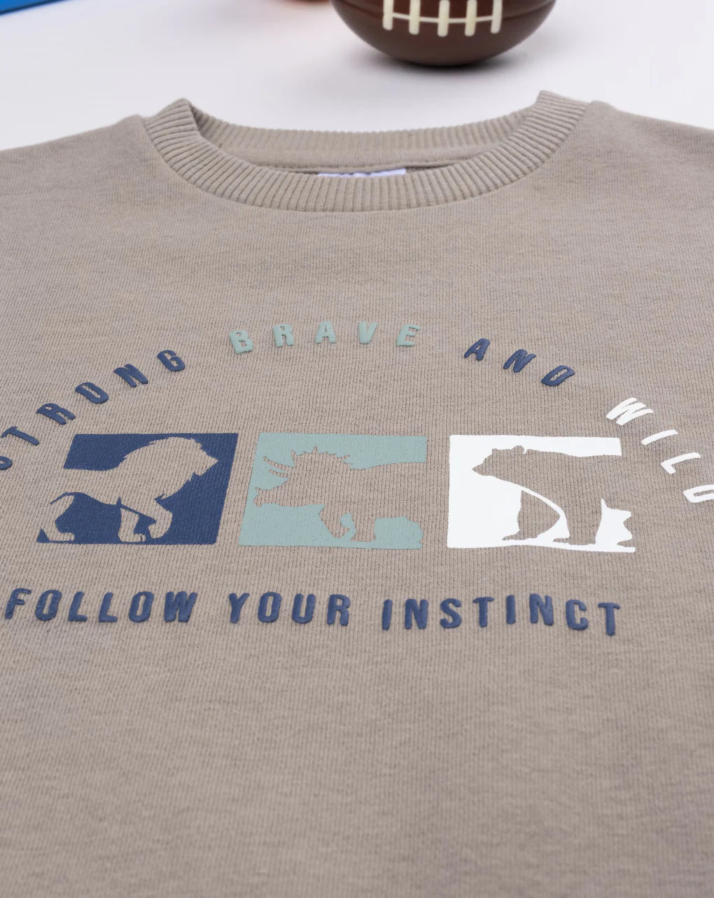 A casual French terry sweatshirt for boys. The piece features a brown base with a matching stylized print. The snap buttons on the back ensure a relaxed and practical fit. This boys' sweatshirt is suitable for casual occasions and easy to combine. Accessories not for sale. The package contains the item of clothing only.