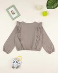 A casual, brushed-on sweatshirt for girls. The piece features a brown base, a matching print, and a matching frill. The fit is relaxed and regular. This girl's sweatshirt is suitable for casual occasions. Accessories are not for sale. The package contains the item of clothing only.