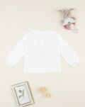 A cute long-sleeved T-shirt for girls. The piece features a cream-white base with a matching bunny print and elasticated cuffs. The snap buttons on the back ensure a relaxed and practical fit. This girls' T-shirt is suitable for casual occasions and easy to combine. Accessories not for sale. The package contains the item of clothing only.