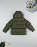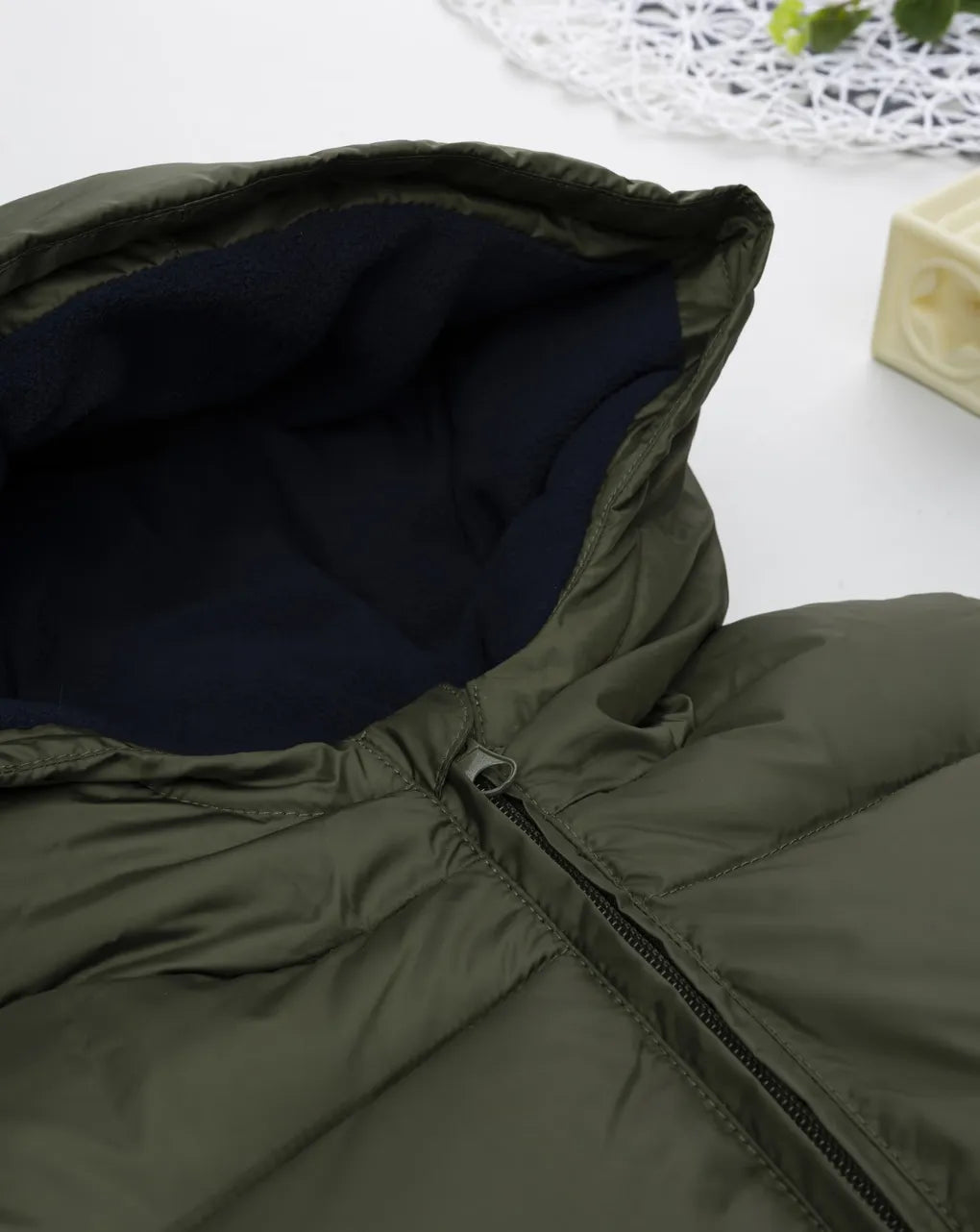 A casual, hooded down jacket for boys. This all-green piece features a variety of pockets and a faux fur lining. The front zip and snap buttons provide a relaxed, practical fit. This waterproof boys' down jacket is suitable for casual occasions. Accessories are not for sale. The package contains the clothing item only.