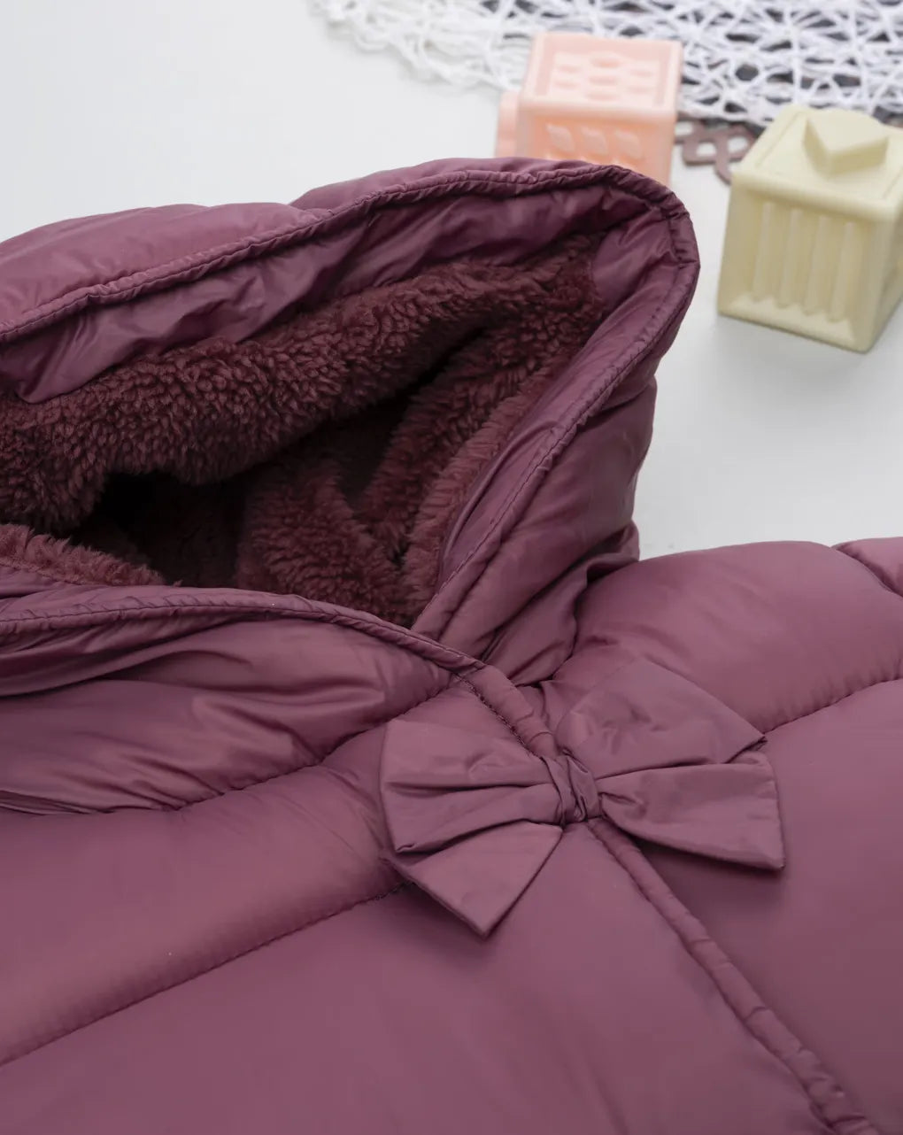 A sweet girls' hooded down jacket. The piece comes in all-over antique pink with faux fur lining. The front zip and snap buttons make it comfortable and practical. This girls' down jacket is waterproof and suitable for casual occasions. Accessories are not for sale. The package contains the clothing item only.