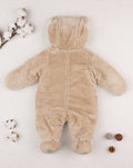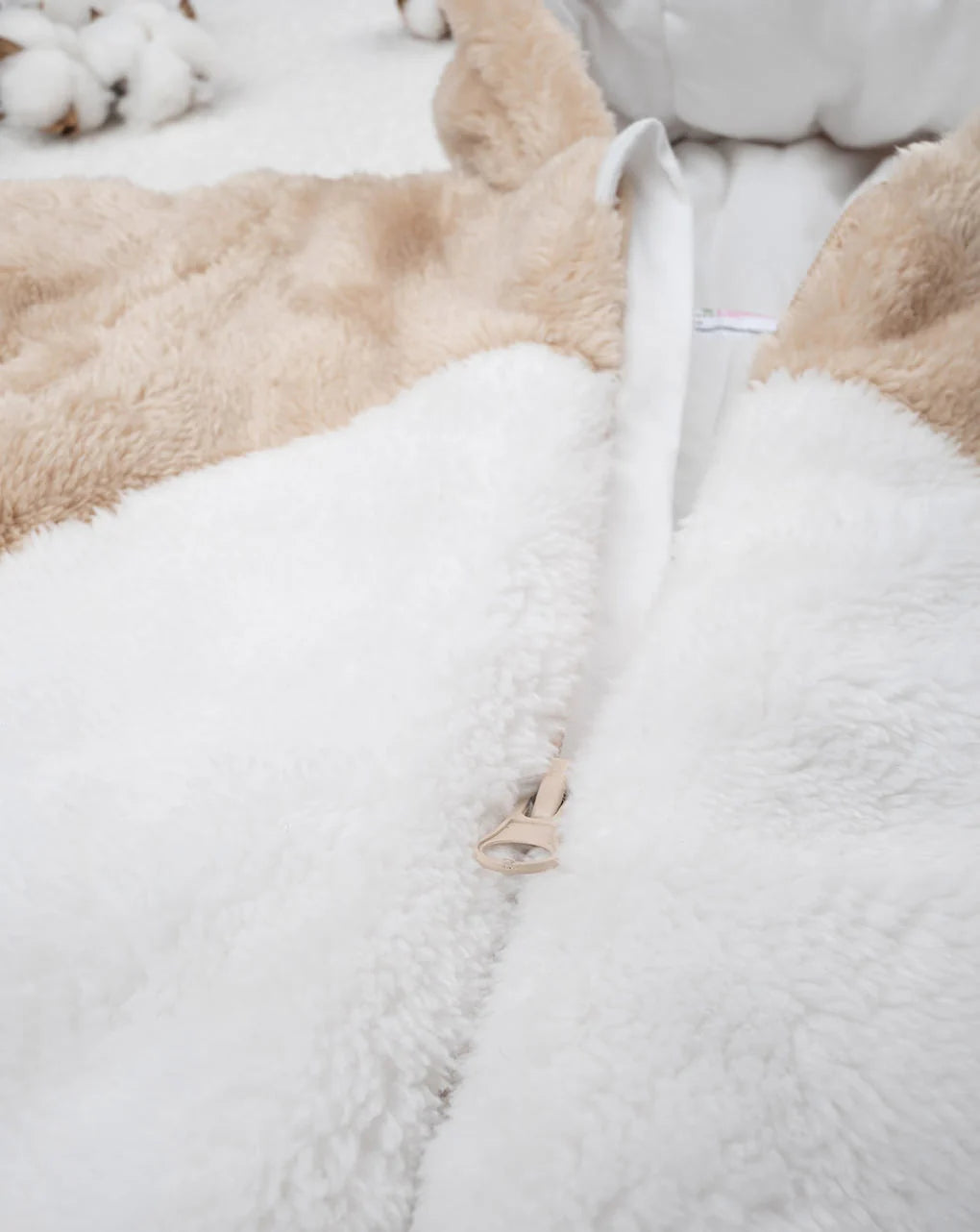 Unique faux fur snowsuit for children, made of 100% polyester. The piece comes in a teddy bear design, complete with slippers, mittens, a hood, and ears, and comes in pastel brown and cream. The front zip makes it soft and practical. This faux fur snowsuit for children is cozy and particularly warm. Accessories not for sale. The package contains the clothing item only.