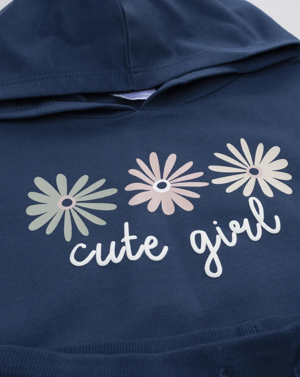 Casual two-piece jogging outfit for girls with brushed interior. The outfit includes a blue hoodie with a print; all-blue pants with a small print. The fit is relaxed and adjustable thanks to the elastic waistband. This girls' jogging outfit is suitable for casual/sporty occasions. Accessories not for sale. The package contains the clothing item only.