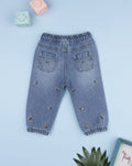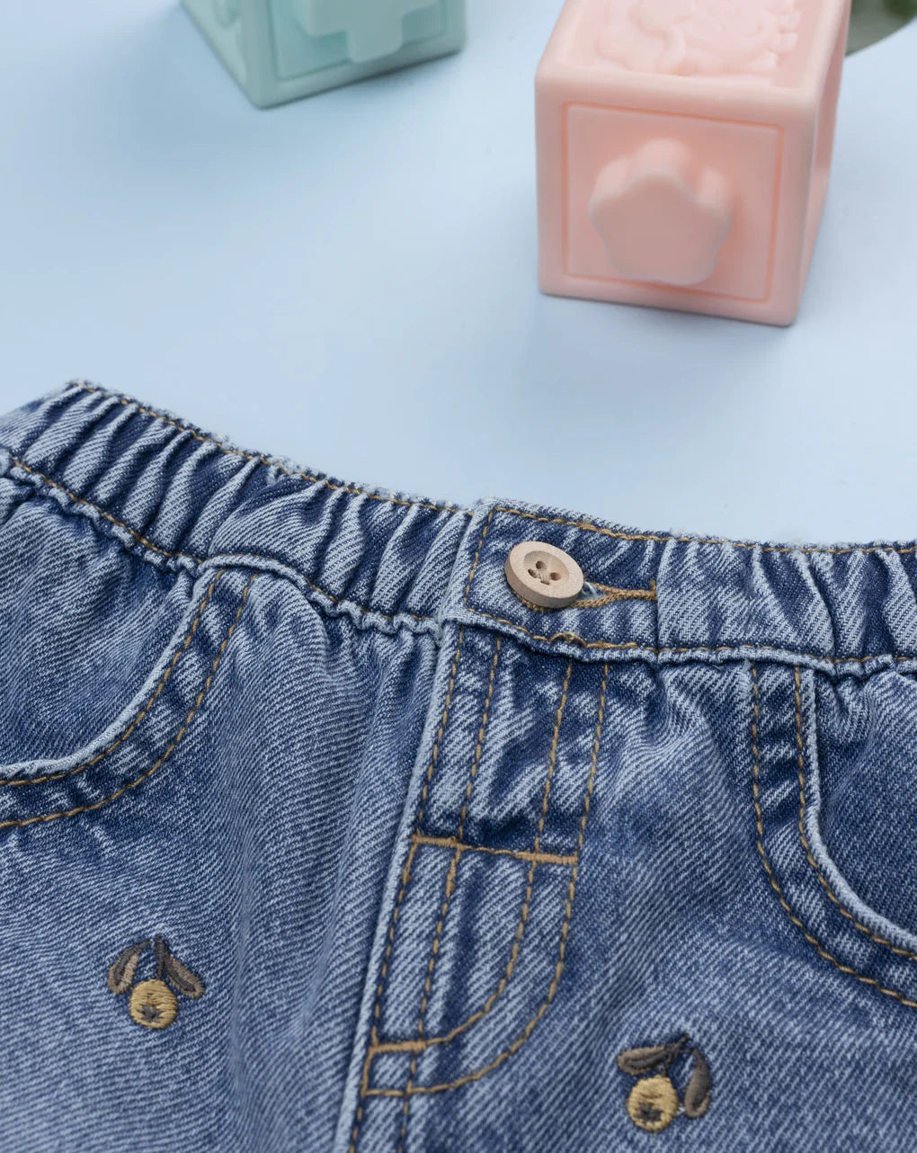 Casual denim trousers for girls. The piece is made of light denim blue with a small allover floral print in a matching color. It features shaped pockets on the front and patch pockets on the back. The fit is relaxed and adjustable thanks to the elastic waistband and button. These girls' trousers are suitable for casual occasions and are easy to combine. Accessories not for sale. The package contains the item of clothing only.