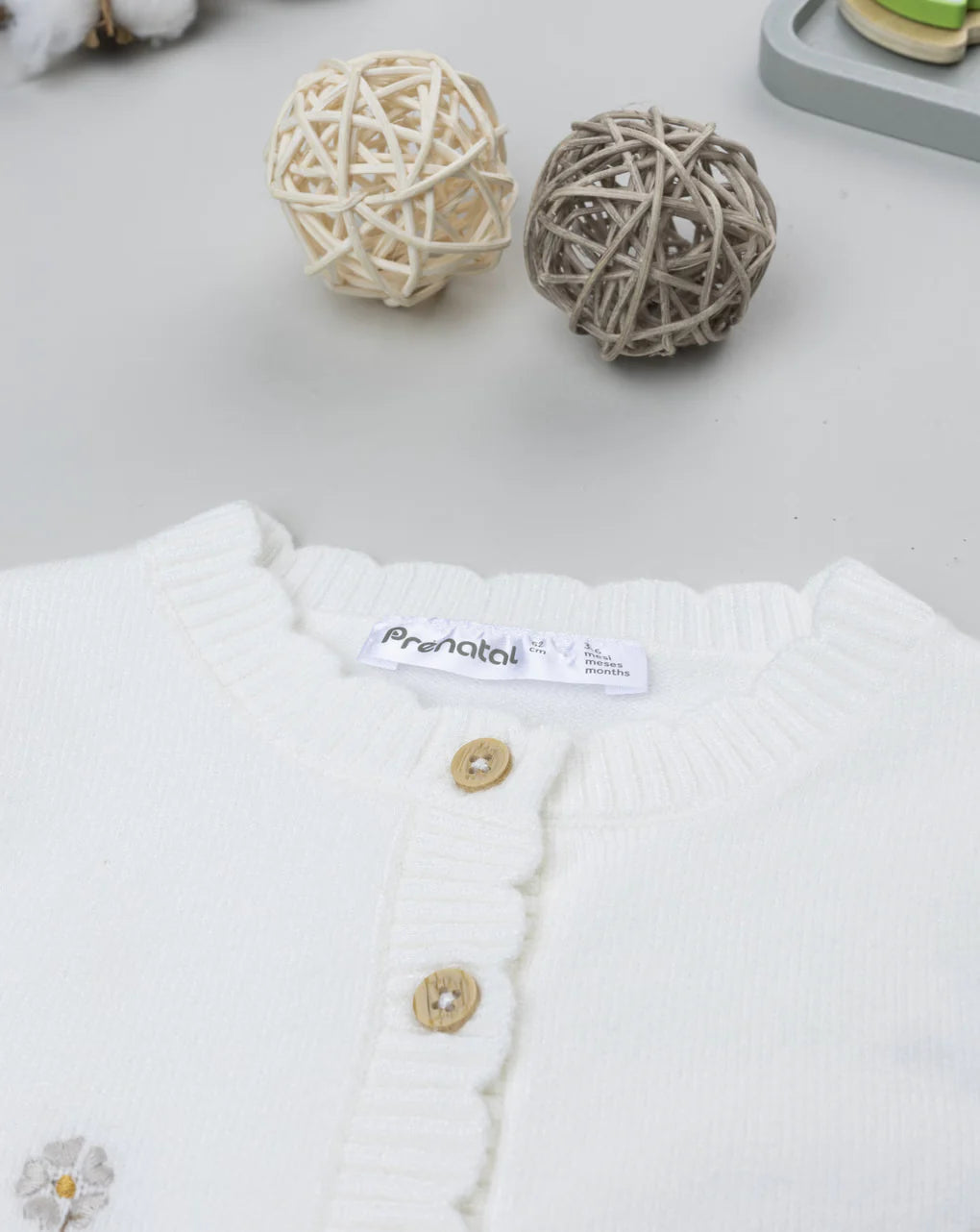 Girls' knitted cardigan. The piece features a white base with small floral embroidery as decorations. Two pockets on the front. Wavy edges add a touch of sophistication. It fastens with wooden buttons at the front. The fit is relaxed and practical thanks to the matching buttonholes. Accessories not for sale. The package contains the item of clothing only.