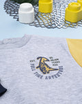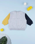 Casual boys' sweatshirt. The piece features a light gray base with blue and yellow sleeves. The snap buttons on the back ensure a relaxed and practical fit. The sweatshirt is lined inside. This boys' sweatshirt is suitable for casual occasions and easy to combine. Accessories are not for sale. The package contains the item of clothing only.