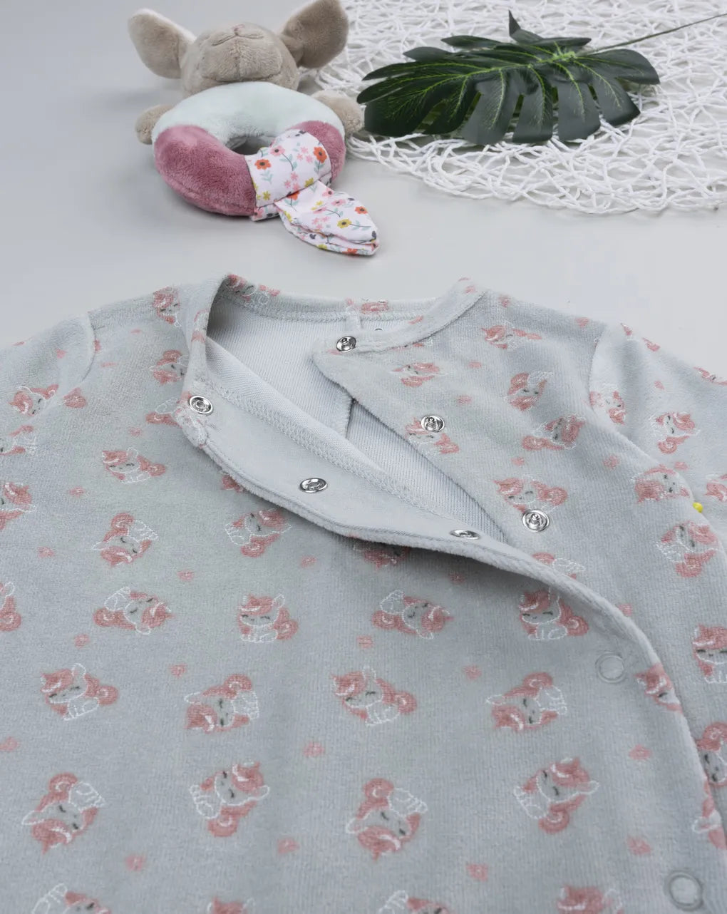 A sweet chenille baby girl's one-piece romper with a footed design and a green background with a matching print. The fit is soft and practical thanks to the snaps on the front and at the crotch. Made from OEKO-TEX® cotton, tested for harmful substances, it guarantees high safety. Accessories are not for sale. The package contains the clothing item only.