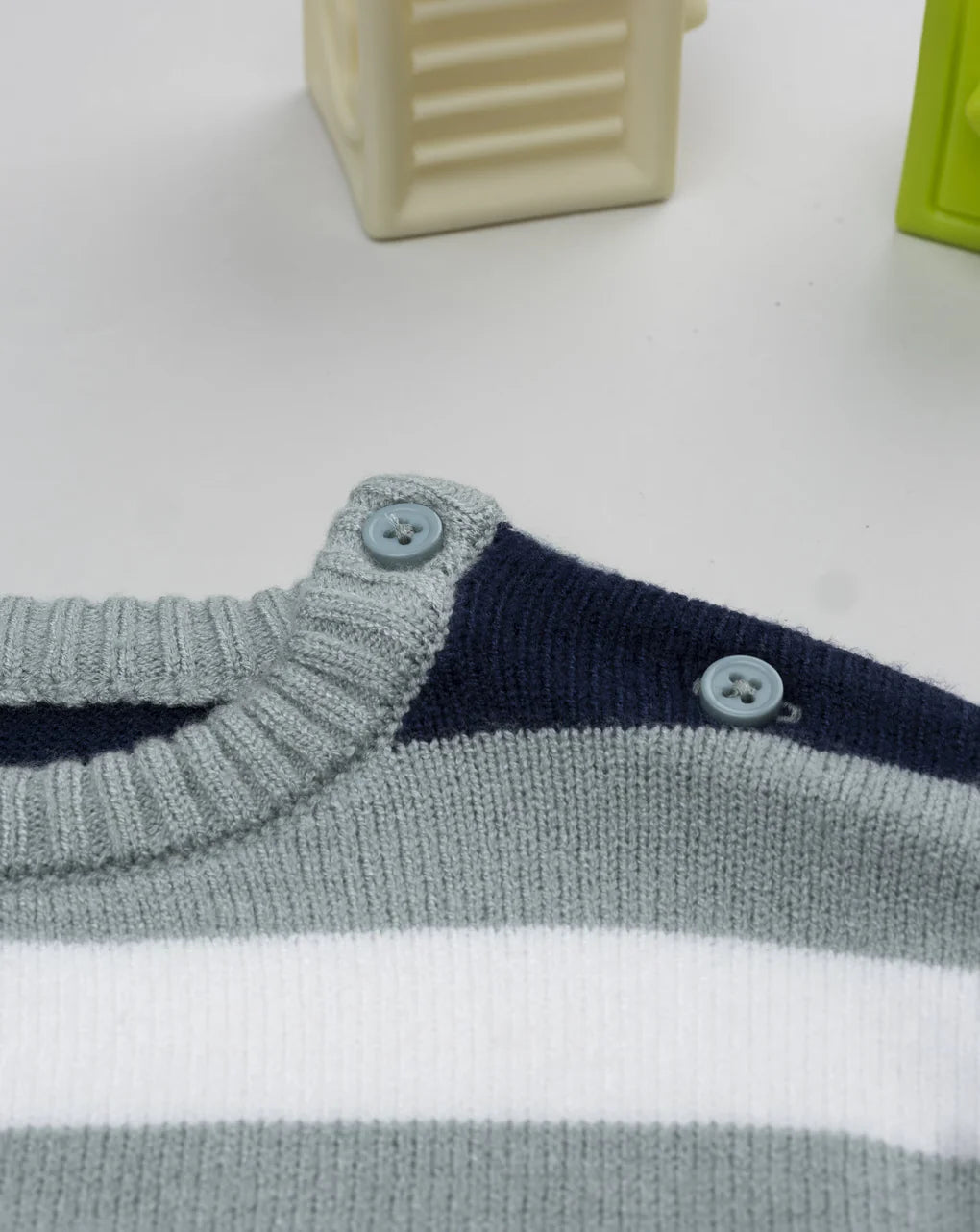 Casual boys' tricot sweater. The piece features a gray and blue striped pattern. The fit is relaxed and practical thanks to the shoulder buttonholes. This boys' tricot sweater is suitable for casual occasions and easy to combine. Accessories not for sale. The package contains the item of clothing only.