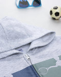 Casual two-piece jogging suit for boys. The outfit includes a gray hoodie with a matching print and a zip on the front; all-blue pants with an elastic waistband. This boys' jogging suit is suitable for casual occasions. Accessories not for sale. The package contains the clothing item only.