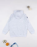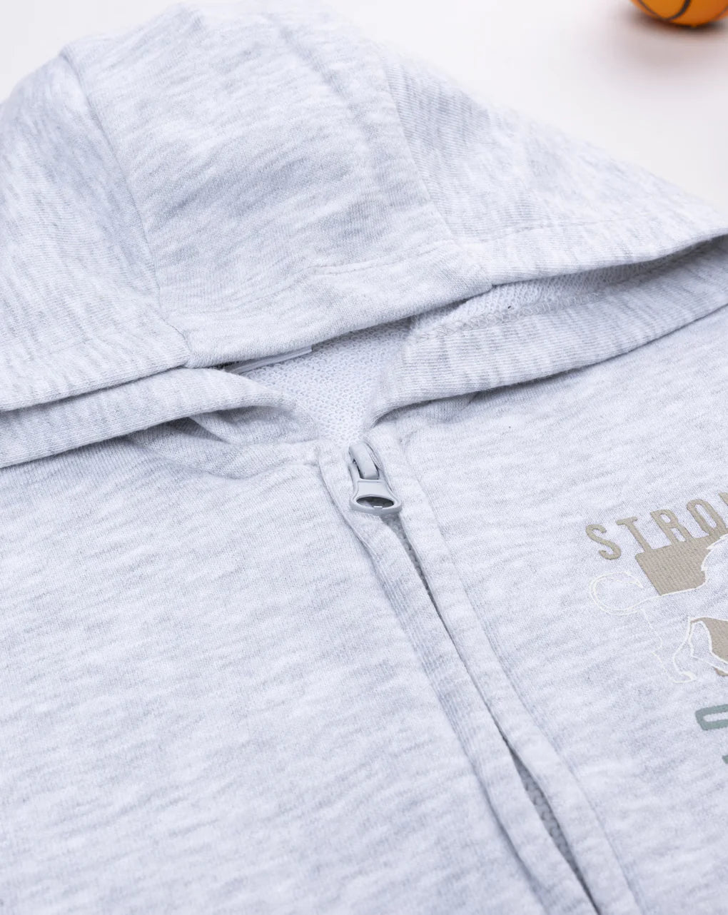 Casual French terry hoodie for boys. The light gray piece features a small, coordinating print and side pockets. The front zip provides a relaxed, practical fit. This boys' sweatshirt is suitable for casual occasions. Accessories are not for sale. The package contains the item of clothing only.