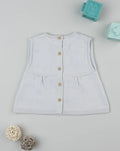 Casual girls' knitted vest. This garment features a textured weave and comes in a light beige color. It has a relaxed, regular fit. This girls' vest is suitable for casual occasions and easy to combine. Accessories are not for sale. The package contains the garment only.