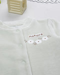 A sweet little girl's chenille onesie. This one-piece piece features a footed design, set against a green background with a small matching image. The snaps at the front and crotch provide a soft and practical fit. Made from OEKO-TEX certified cotton, tested for harmful substances, it guarantees high levels of safety. Accessories are not for sale. The package contains the clothing item only.