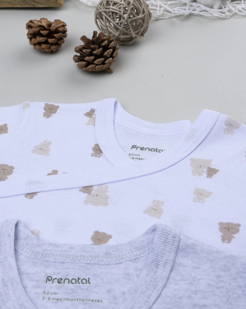 Basic 2-pack of long-sleeved bodysuits for boys. The pieces feature a gray and white base with a matching teddy bear print and a wrap-over cut. The snaps at the crotch provide a loose and practical fit. Made from OEKO-TEX® cotton, tested for harmful substances, this garment guarantees high safety. Accessories are not for sale. The package contains the clothing item only.