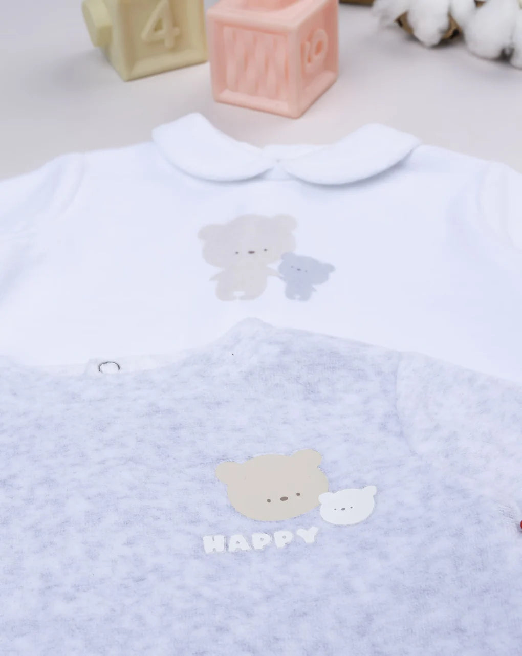 Pack of 2 chenille outfits for newborns. The pieces include a white and gray long-sleeved shirt with snaps on the back, and matching bottoms with a teddy bear print. The fit is soft and adjustable thanks to the elastic waistband. The piece is made of OEKO-TEX® cotton, tested for harmful substances and ensuring high safety. Accessories not for sale. The package contains the clothing item only.