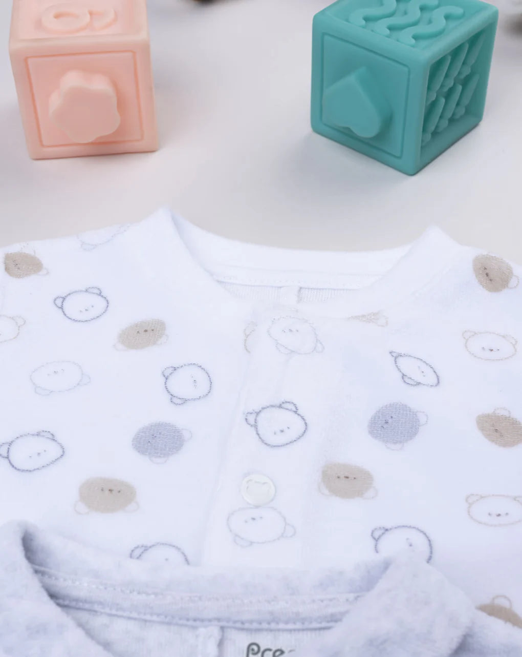 Pack of 2 chenille baby onesies. The one-piece garments feature matching feet and a white and light gray base with a matching teddy bear print. The snaps at the front and crotch provide a soft and practical fit. Made from OEKO-TEX® cotton, tested for harmful substances, this garment guarantees high safety. Accessories are not for sale. The package contains the clothing item only.