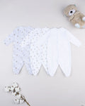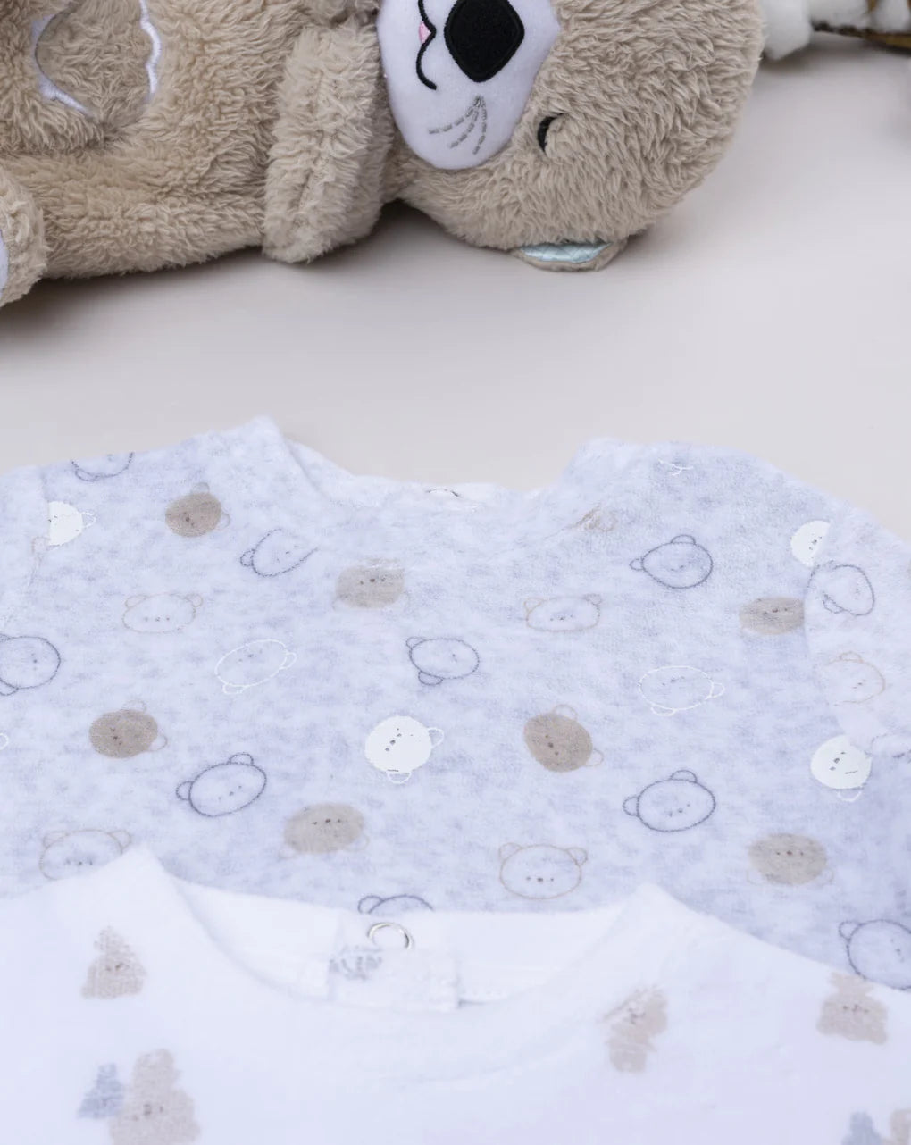This pack includes three long, footed baby onesies. The first one is a solid white onesie with a teddy bear print on the front. It features a refined collar. The second one is white and features an allover print with contrasting beige and gray teddy bears. The third one features an allover teddy bear print on a gray background. It fastens at the back and crotch with practical snaps. Accessories not for sale. The pack contains clothing items only.
