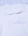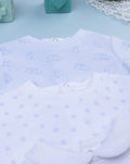 Pack of three long chenille baby onesies with feet. The first one is a solid white onesie with a dog print on the front. It features a refined collar. The second one is white and features an allover print with contrasting blue paws. The third one features an allover dog print on a blue background. It fastens at the back and crotch with practical snaps. Accessories not for sale. The pack contains clothing items only.