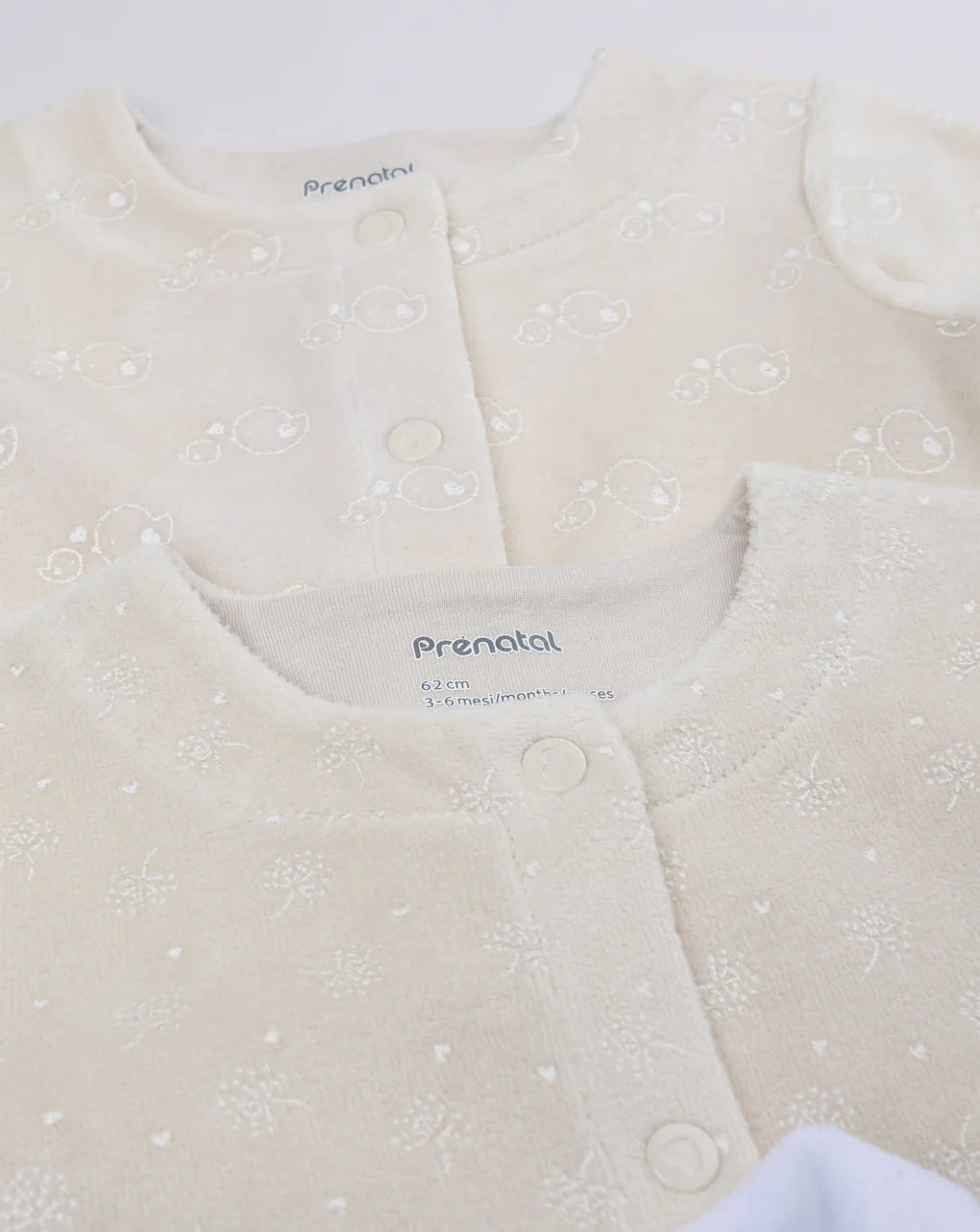 A sweet 3-pack of baby girls' onesies. The garments are a one-piece set with a foot on a white or beige background and a matching print. The snaps on the front and crotch provide a soft and practical fit. The garment is made from OEKO-TEX® cotton, tested for harmful substances and ensuring high safety. Accessories are not for sale. The package contains the clothing item only.