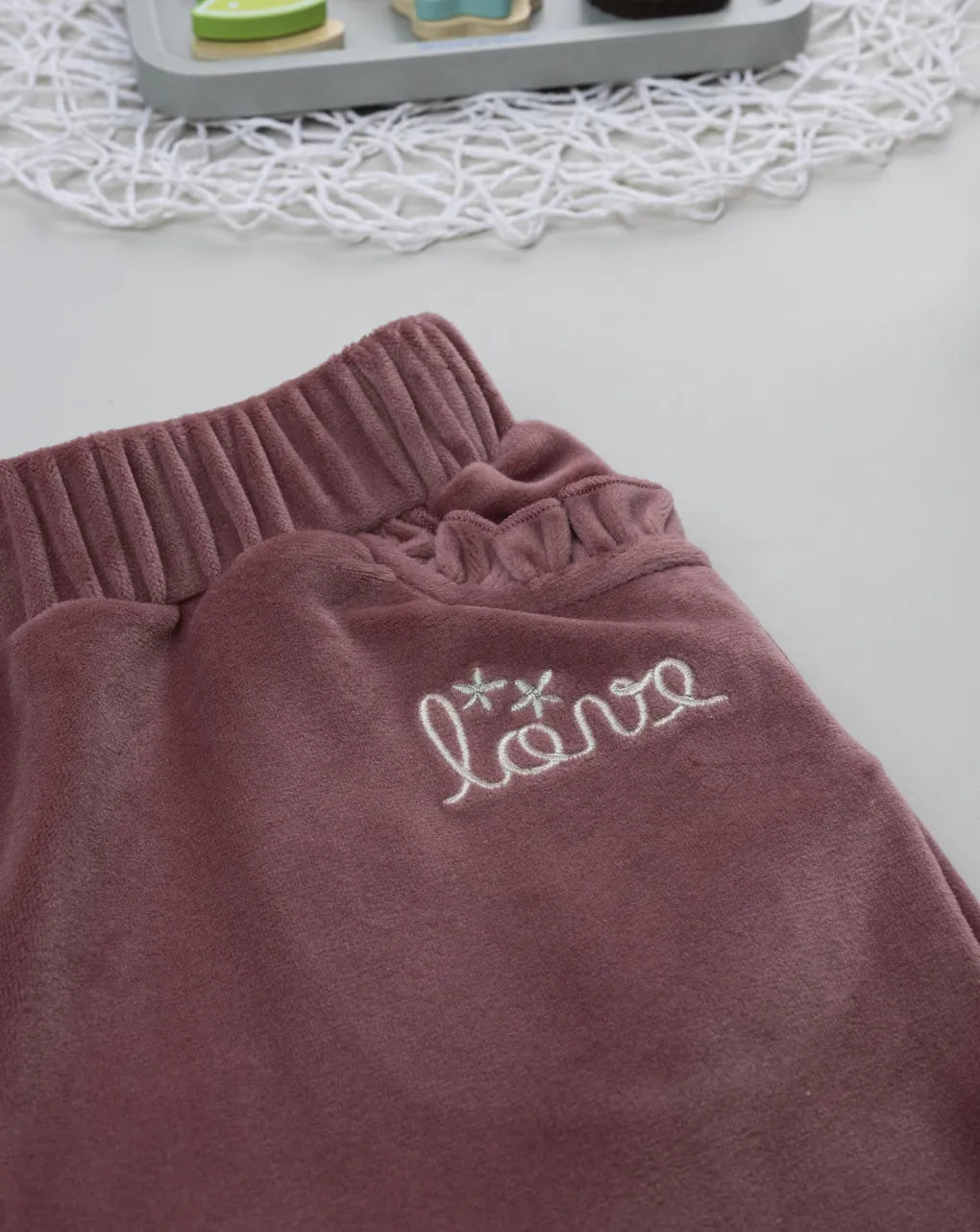 Casual chenille sweatpants for girls. The piece comes in all-over antique pink with a small, matching embroidery and side pockets accented with matching frills. The fit is loose and adjustable thanks to the elastic waistband. These girls' trousers are suitable for casual occasions and are easy to combine. Accessories not for sale. The package contains the item of clothing only.