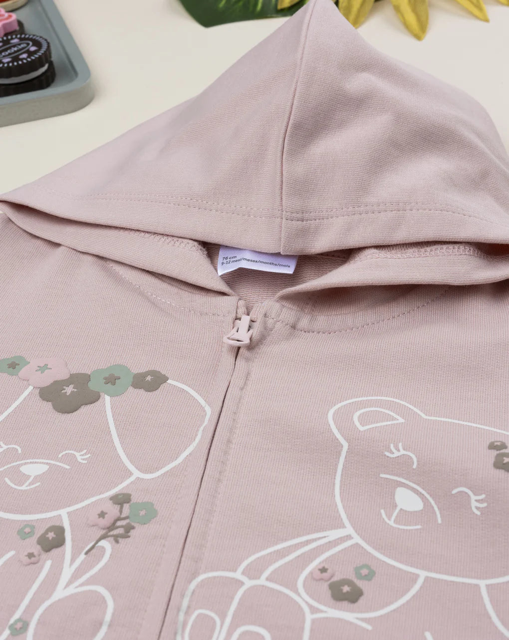 Casual girls' brushed hoodie. The piece features a dusty pink base with a stylized white teddy bear print. The front zip provides a loose and practical fit. This girls' hoodie is suitable for casual occasions and easy to combine. Accessories not for sale. The package contains the item of clothing only.