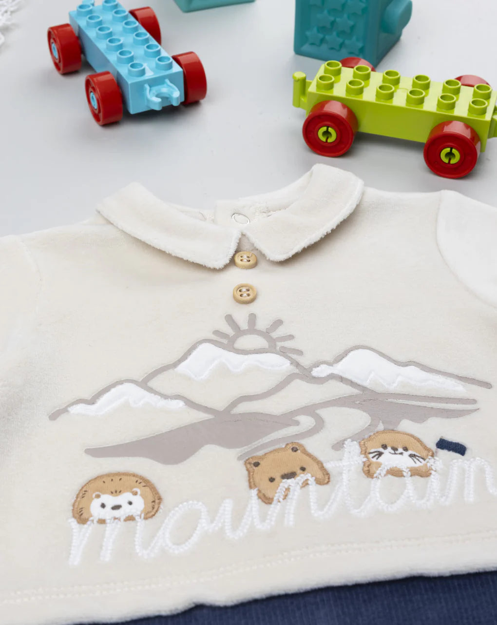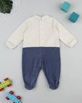 A sweet baby boy's chenille onesie. This one-piece, footed onesie comes in a two-tone beige and blue version with a matching print. The snaps at the back and crotch provide a soft and practical fit. Made from OEKO-TEX® cotton, tested for harmful substances, it guarantees high safety. Accessories are not for sale. The package contains the clothing item only.