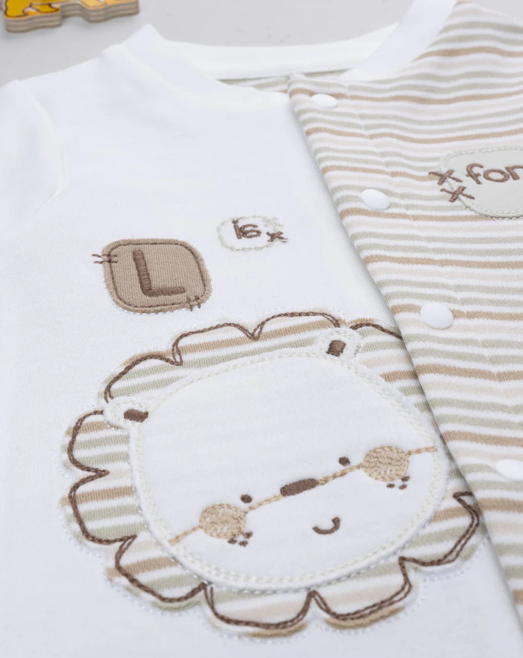 A sweet baby girl's onesie. This one-piece, footless piece features a two-tone white background with a cute lion print and beige stripes. The snaps at the front and crotch provide a comfortable, comfortable fit. Made from OEKO-TEX® cotton, tested for harmful substances, it guarantees high levels of safety. Accessories are not for sale. The package contains the clothing item only.