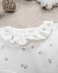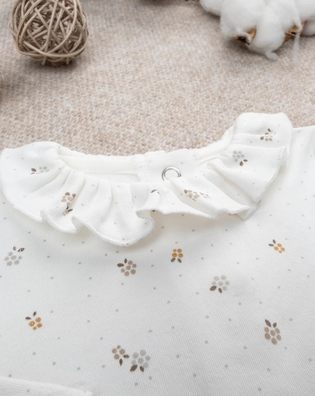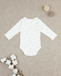 Basic, long-sleeved organic cotton bodysuit for girls. The piece features a cream-white base with a matching allover print. Snap buttons at the crotch ensure a comfortable, comfortable fit. Made from OEKO-TEX certified cotton, tested for harmful substances, it guarantees high safety. Accessories are not for sale. The package contains the clothing item only.